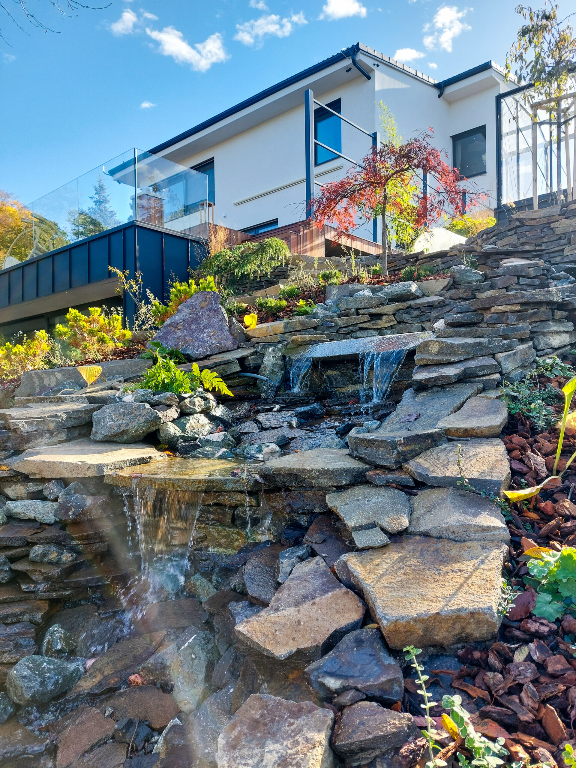 Vodné prvky dodávajú záhrade jedinečnú atmosféru a pocit pokoja. Zvuk vody pôsobí relaxačne a zároveň vytvára prirodzený vizuálny prvok.